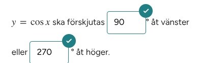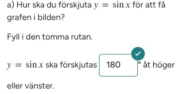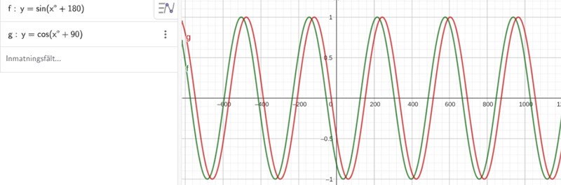Jag undrar, i och med att vi har funktionen y=sin(x+180) i bilden, måste inte y=cosx förskjutas 90 grader åt HÖGER för att vi ska få tillbaka våran sinusfunktion? Dessutom stämde inte svaren överens med GeoGebra, graferna är inte identiska? (Se nedan). Jag undrar dessutom varför det blev 270 grader åt höger i och med att jag bara gissade på 90 + 180...