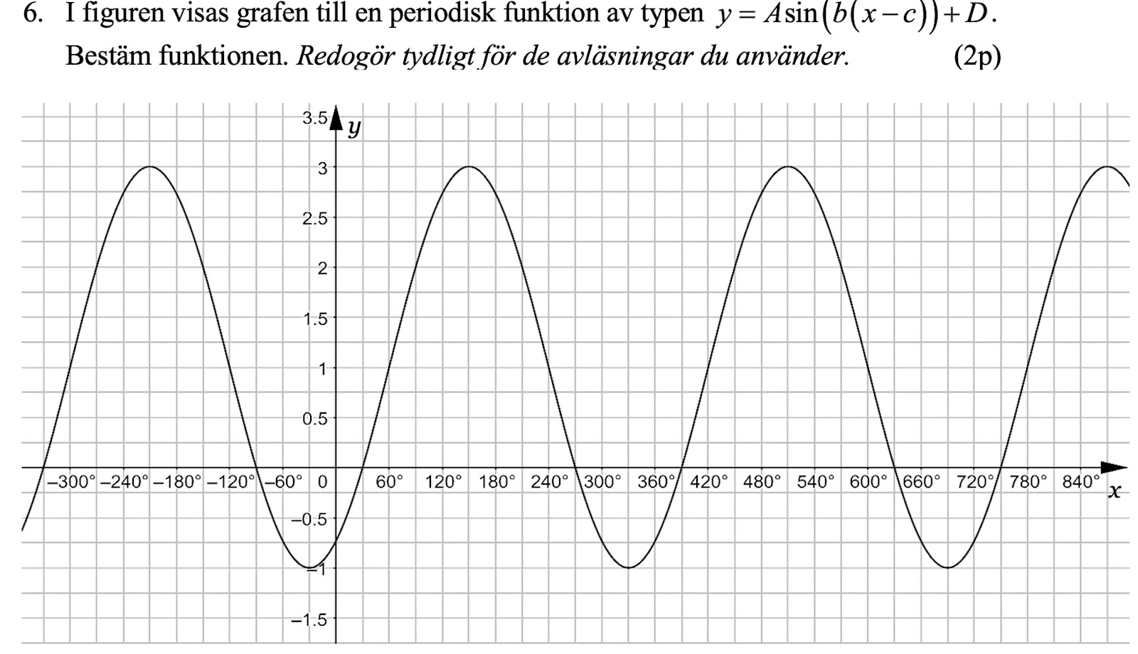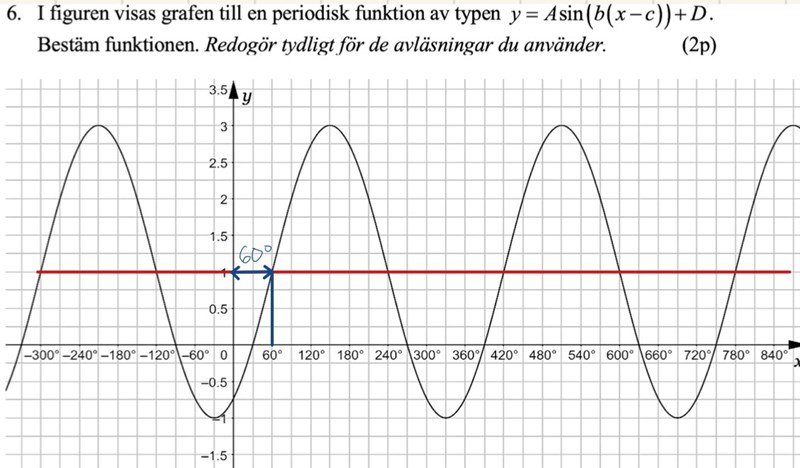 Om vi lägger in jämviktsläget ("nollnivån") med ett blått streck så ser du att sinuskurvan passerar denna nivå på uppväg vid x = 60°