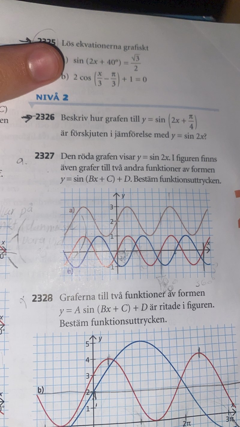 på b) grafen får jag det till y=sin(2x-60) för att hag får varje ruta till 30 grader, men i facit står det -120 istället för -60