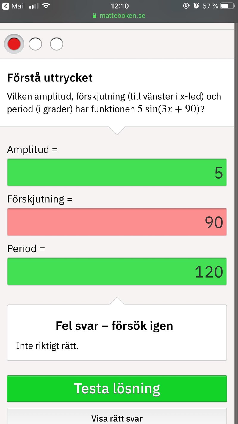 Löser just nu uppgifter på Matteboken.se och har stött på ett problem. Jag har för mig sedan innan att när det står (x+90) är det förskjutet 90° åt vänster och vid (x-90°) är det förskjutet 90° åt höger, oavsett vad som står framför X. Hemsidan vill däremot att man ska dela förskjutningen på k-värdet istället. Vad stämmer?