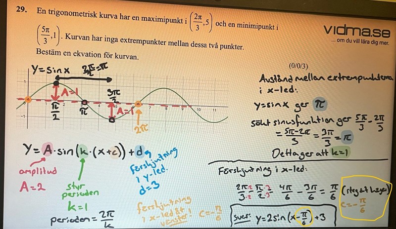 Hej, jag uppskattar ditt svar, dock är förskjutningen åt vänster så som jag förstår det då det originellt ska vara pi/2. Jag drar slutsatsen att det är en förskjutning till vänster då x-värdet ökar och blir 2pi/3 vilket är större än pi/2. Jag har dessutom memorerat att alla förskjutningar åt höger ska vara minus och alla åt vänster ska vara plus. Jag vet inte om du eller jag har missuppfattat förskjutnings riktningen men du har trots allt fått rätt svar som förvirrar mig lite😅