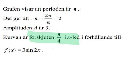 Så kurvan i figuren kan därför skrivas y = 3sin(2(x - pi/4)), vilket är precis den kurva som du får om du flyttar kurvan y = 3sin(2x) med pi/4 steg åt höger.