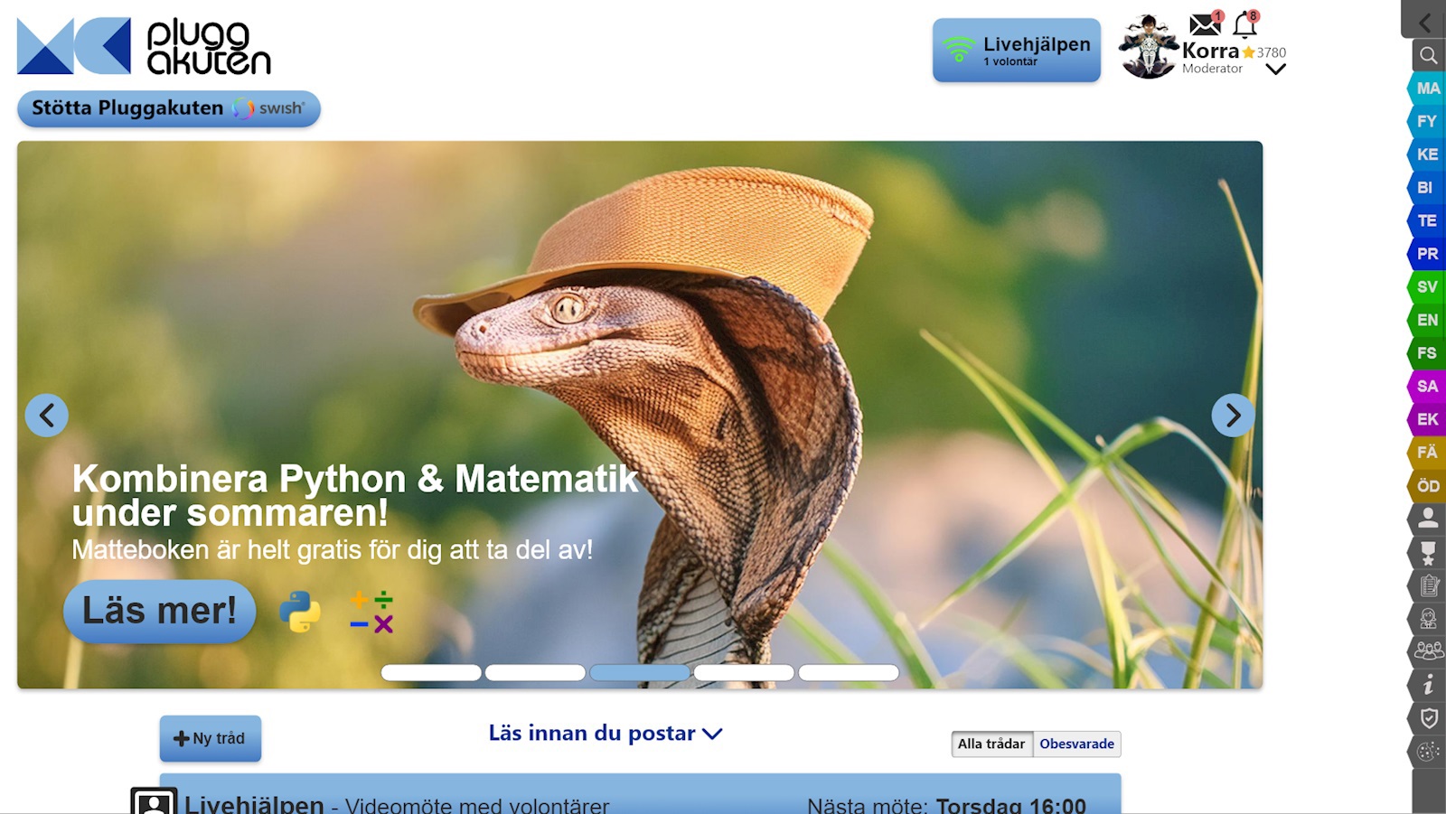 - Slider till höger med alla ämnen (gör att sidan blir större och "renare").