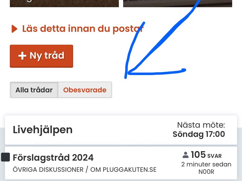 N00R skrev:Ibland kan man lägga ut en tråd utan att få svar på den. Detta kan bero på att det kom flera trådar efteråt som ledde till att den inte syns förutom om man går ner i sidan och letar efter de obesvarade tråden.