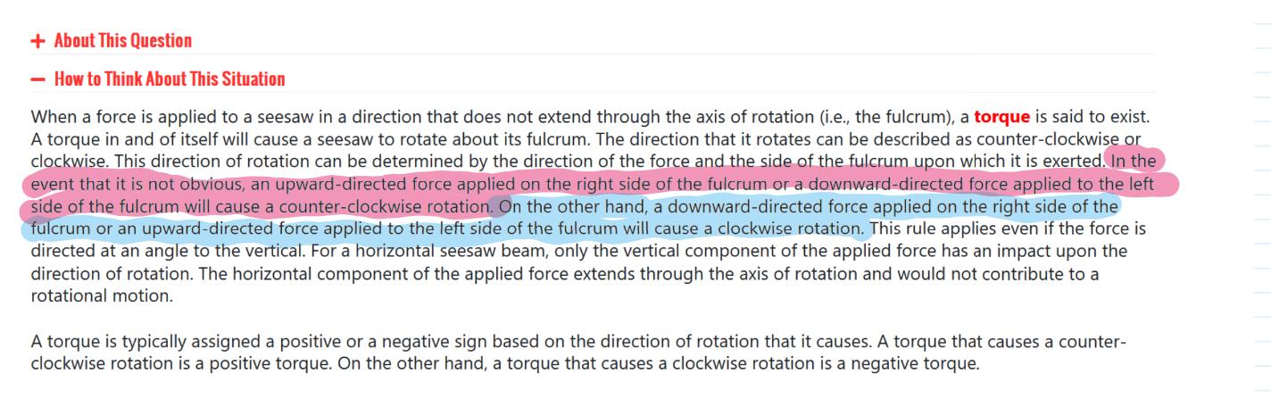 Det står att "an upward-directed force applied on the right side" ger en "counter-clockwise rotation". F är till höger om fulcrum och uppåtriktad.