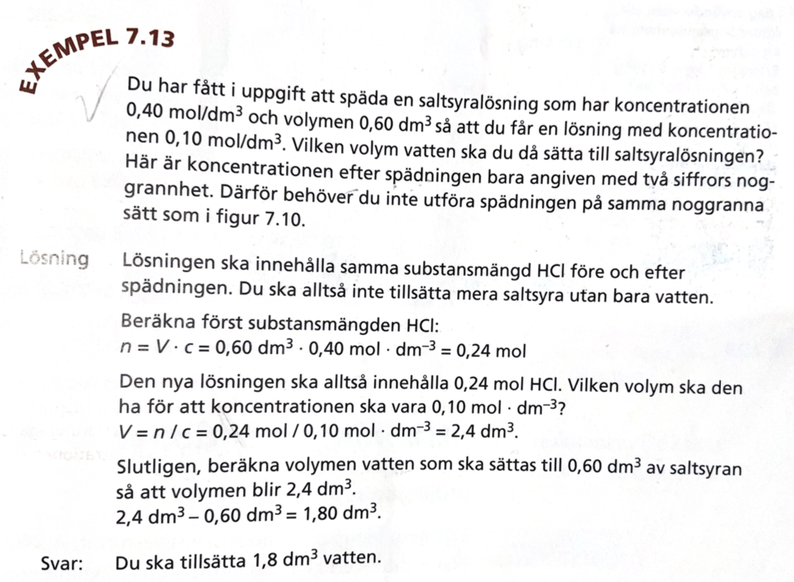 En sak jag inte förstår är stycke där de frågar vilken volym lösningen ska ha om koncentrationen ska vara 0,10. Den frågan ställde jag mig också, när jag försökte lösa uppgiften, men visste inte vilka siffror jag skulle använda för att räkna ut det. Det jag inte förstår är varför man ska räkna ut volymen för hur mycket av lösningen som ska lösas när det senare verkar som att man bara ska lägga till vatten i de befintliga 0,60 dm3