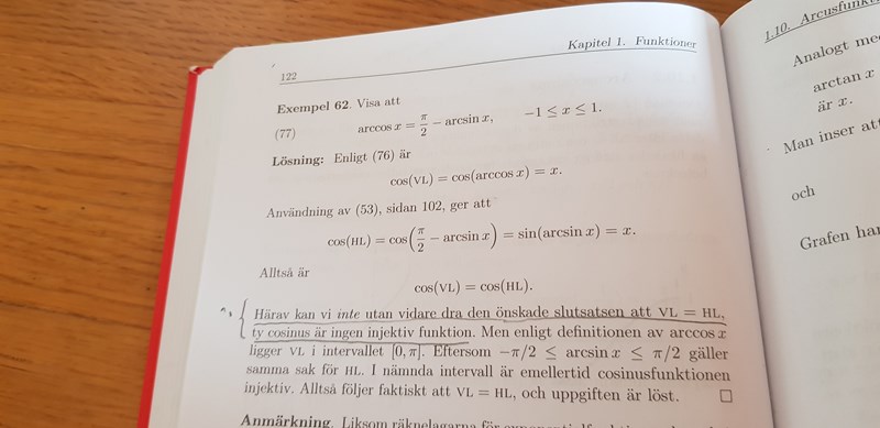 Jag förstår inte varför vi inte kan dra slutsatsen att VL = HL? Även om cosinus inte är någon injektiv funktion vet vi ju att arccos och arcsin är injektiva funktioner och därmed kommer alltid cos ( arccos(x) ) = x och sin ( arcsin(x) ) = x, enligt definitionen av arccsin och arccos?