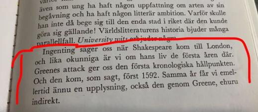 Som jag har fattat, från den här delen får vi information om Shakespeare i London, Den första kronologiska hållpunkten av Shakespeare får vi av Greenes två gånger på 1592-talet. En boktryckare hade publicerat Greenes skrift där han var tvungen att be om ursäkt för att Greenes hade givit en felaktig bild av den man som senare visat sig vara Shakespeare, Shakespeare beskrivs som en mycket skicklig man i sitt yrke dvs som skådespelare. Detta hände då 1592-talet. Det här året har alltså Shakespeare kommit långt i sin karriär men vi kan inte veta hur lång tid det tog för honom för att nå den nivån för att vi har ingen aning om hans ankomst till London. Men en rimligt teori är att det skedde under något av 1580-talet för att det är då han sökte till Londons skådespelartrupper.