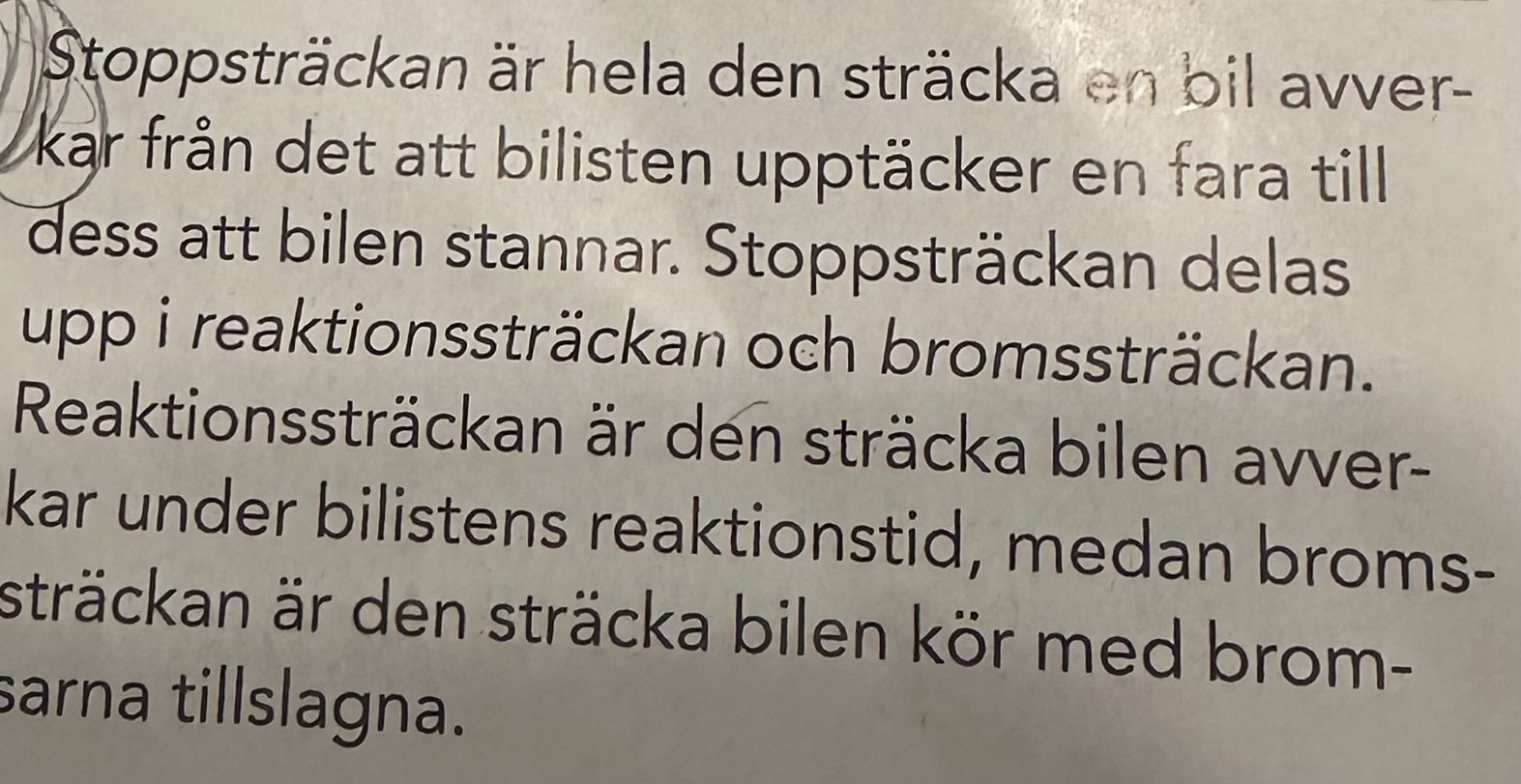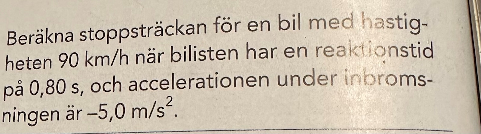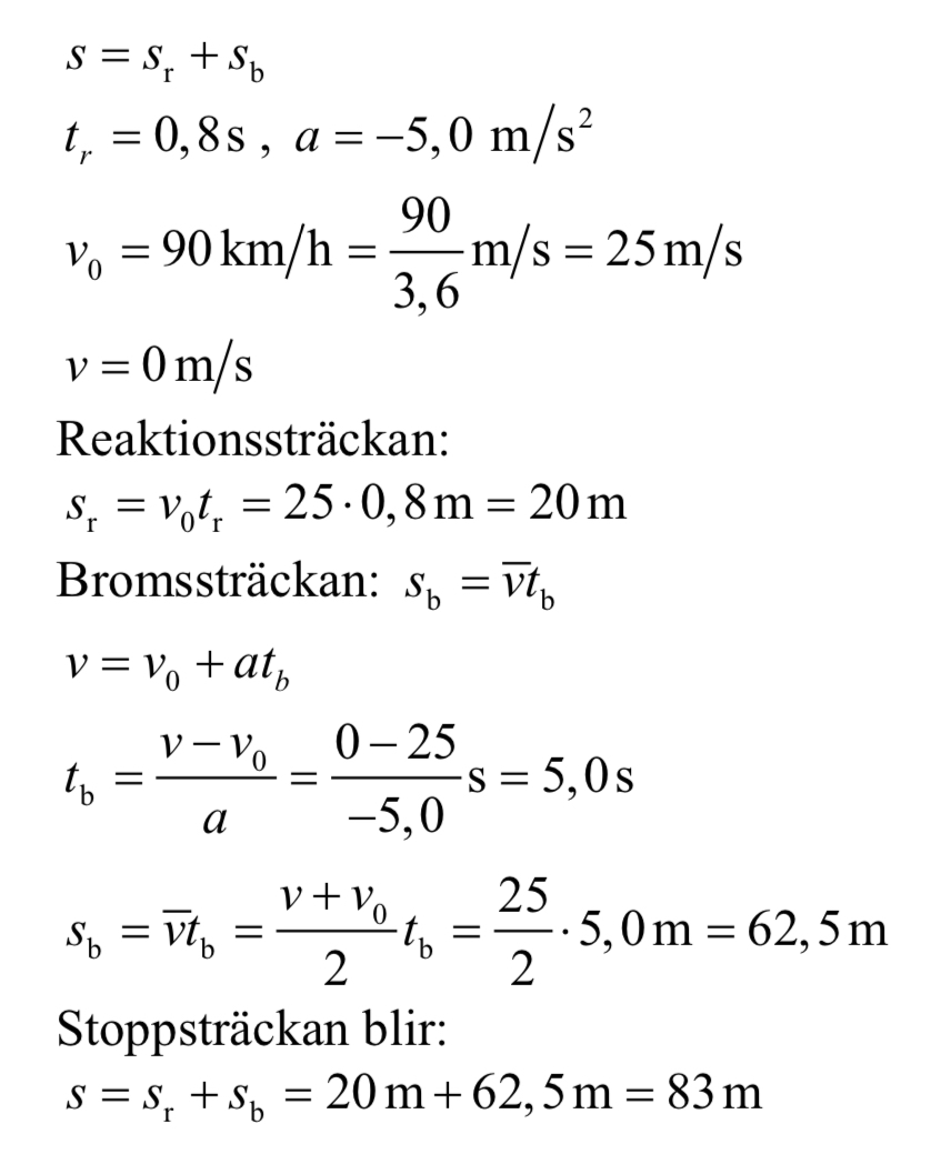 så själva lösningen för den är inte svår men det jag inte förstår är varför man räknar reaktionssträckan med V0•t och bromssträckan med -^V• t (v med streck över, medelhastigheten)