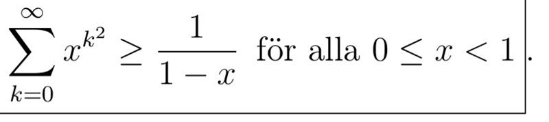 Hej! Jag ska avgöra om den här olikheten är sann eller falsk. I facit står det att den är falsk men jag förstår inte hur man kommer fram till det. Jag tänker som så att det till vänster om olikhetstecknet är en geometrisk summa så därför borde den vara lika med högerledet och därmed borde vänsterledet vara större än eller lika med högerledet och olikheten borde vara sann. Men det är den inte.