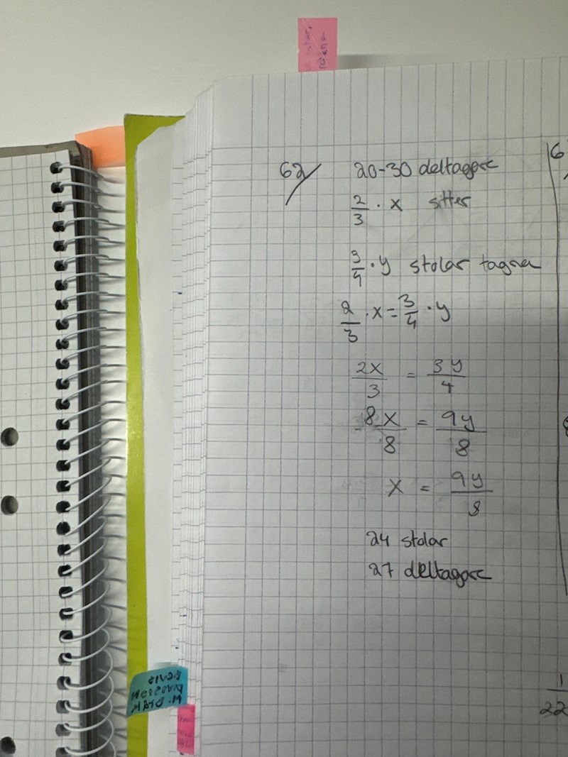 Vi vet att 2/3 av deltagarna sitter på 3/4 av stolarna. Eftersom varje deltagare sitter på varsin stol, så måste 2/3 av deltagarna vara lika många som antalet upptagna stolar, det vill säga:
