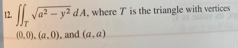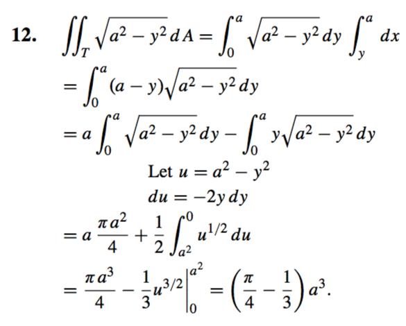 För det andra: om du ritar upp grafen till funktionen f(y)= sqrt(a2-y2) så ser du att du mellan y=0 till y=a får en kvarts cirkel. Med andra ord är det arean av en kvarts cirkel som den första integralen beskriver, en cirkel med radien a. En cirkels area är r*r*pi, så en fjärdedel av det borde bli det som facit säger.