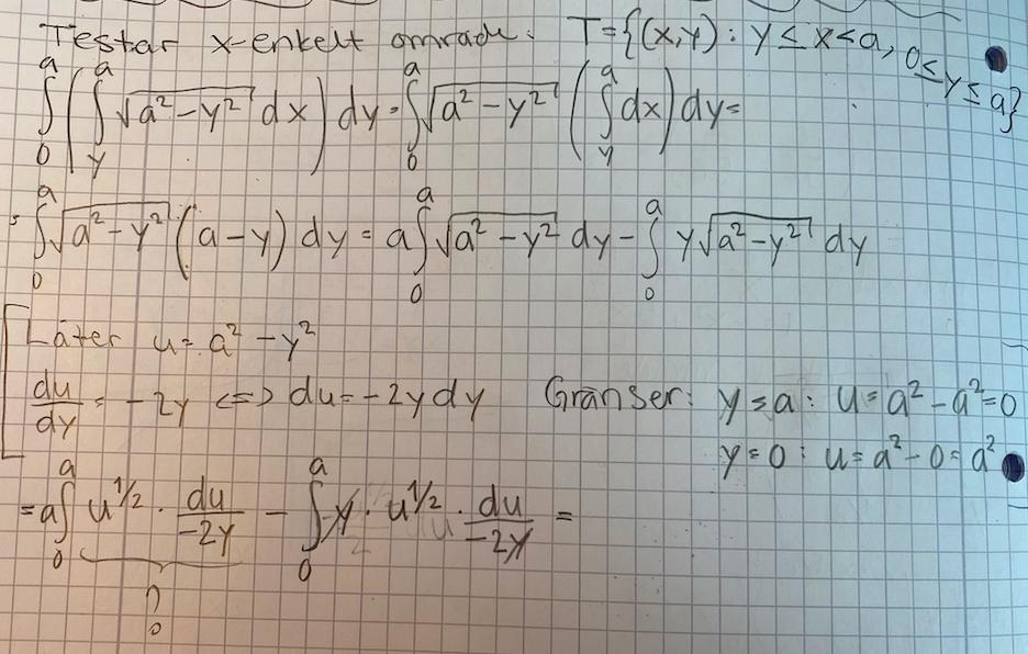 Nu försöker jag göra 12an och längst ner är facit, och i mitten är min lösning men som man ser så får jag problem med att jag har kvar y i en integral där på slutet. Men det känns som att jag gjort något fel där men jag kan inte komma på vad. (insåg nu också att jag glömde byta gränserna där på själva integralen men det jag behöver hjälp med är där det står frågetecken)