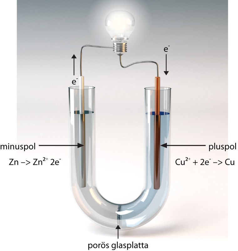 Vilken dålig förklaring! Står det verkligen ingenting om att det finns negativa joner som flyttar sig från kopparlösningen till höger genom den porösa glasplattan och till zinklösningen till vänster, så att det blir en sluten elektrisk krets och att både höger-och vänsterhalvan är oladdad?