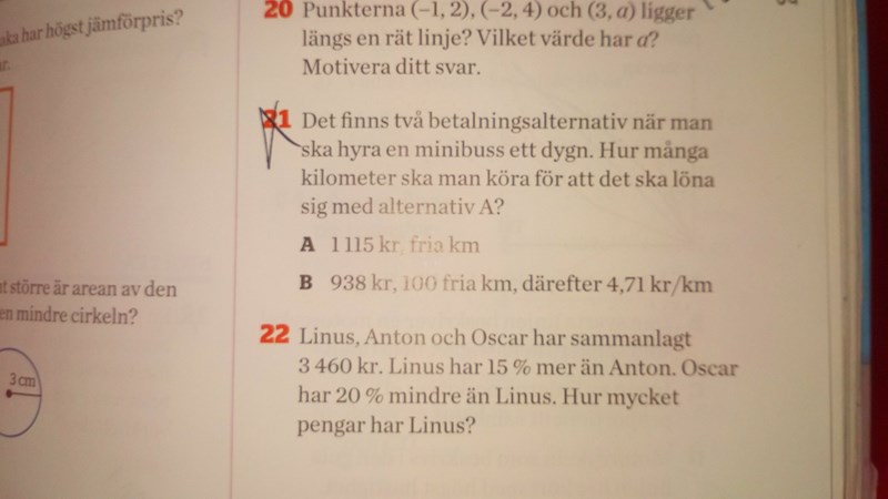 Jag verkligen förstår inte frågan 21 , alltså ka nån förklara vad betyder 1115kr fria km och 938kr , 100 fria km, darefter 4,71kr/km