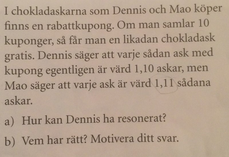 Om man betalar för 10 chokladaskar får man totalt 11 askar + en kupong.