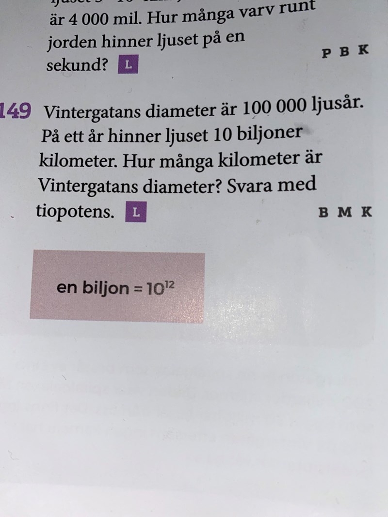 Uppgiften säger att ett ljusår motsvarar 10 biljoner km.
