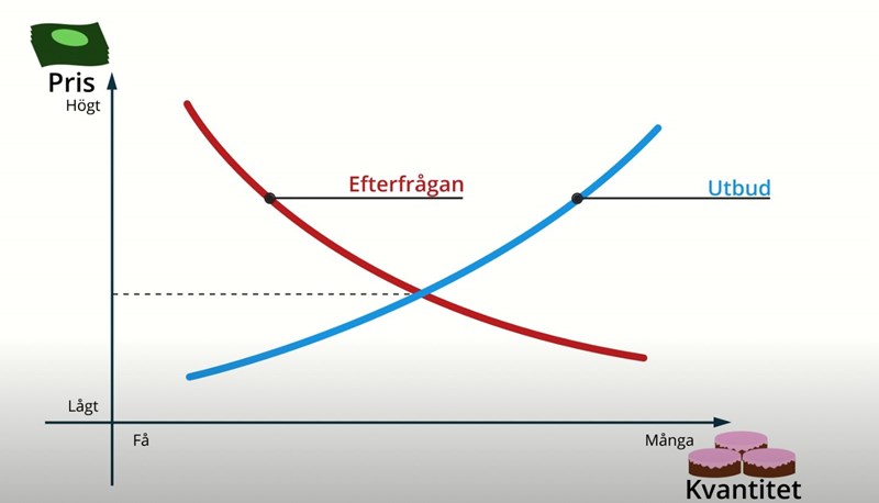 Om det finns massor av tårtor utan glasyr och efterfrågan på dem är låg, alltså inte så många är sugna på de tårtorna. Då kommer bagaren få ta ut ett ganska lågt pris för att kunna kanske ändå få sålt alla tårtorna han bakat trots att efterfrågan är låg.
