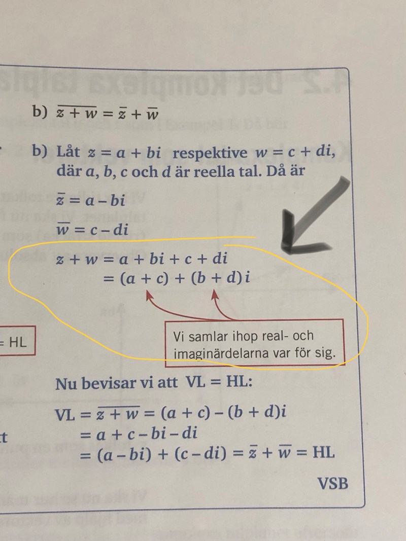 Hej! Har en exempeluppgift i boken som jag inte förstår. Först kallar de z=a+bi och w=c+di och tar fram komplexkonjugatet. Men när de ska addera så adderar de inte komplexkonjugaten utan de tidigare definitionerna z=a+bi och w=c+di. Förstår inte hur det går ihop när man ska addera kompexkonjugaten till de för att bevisa att komplexkonjugaten i olika termer har samma värde. Vänligen se bild.