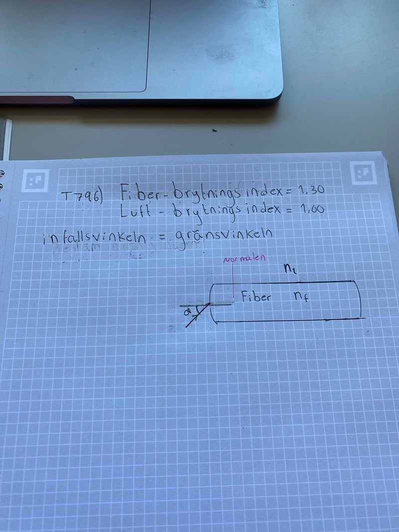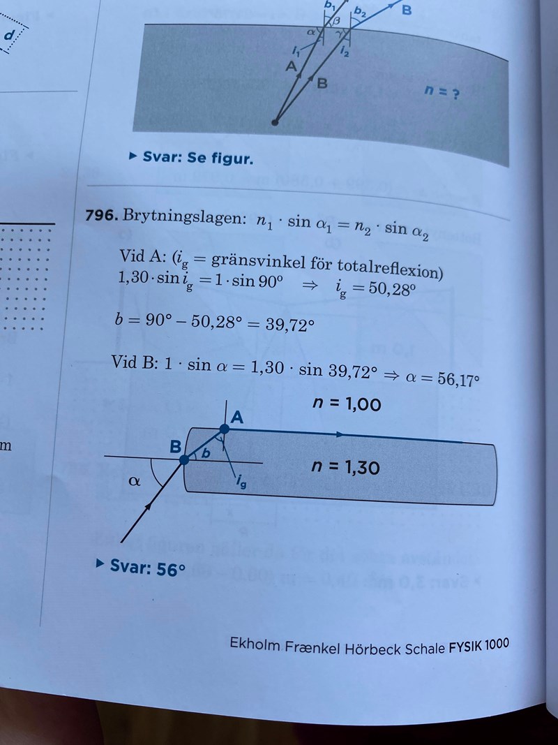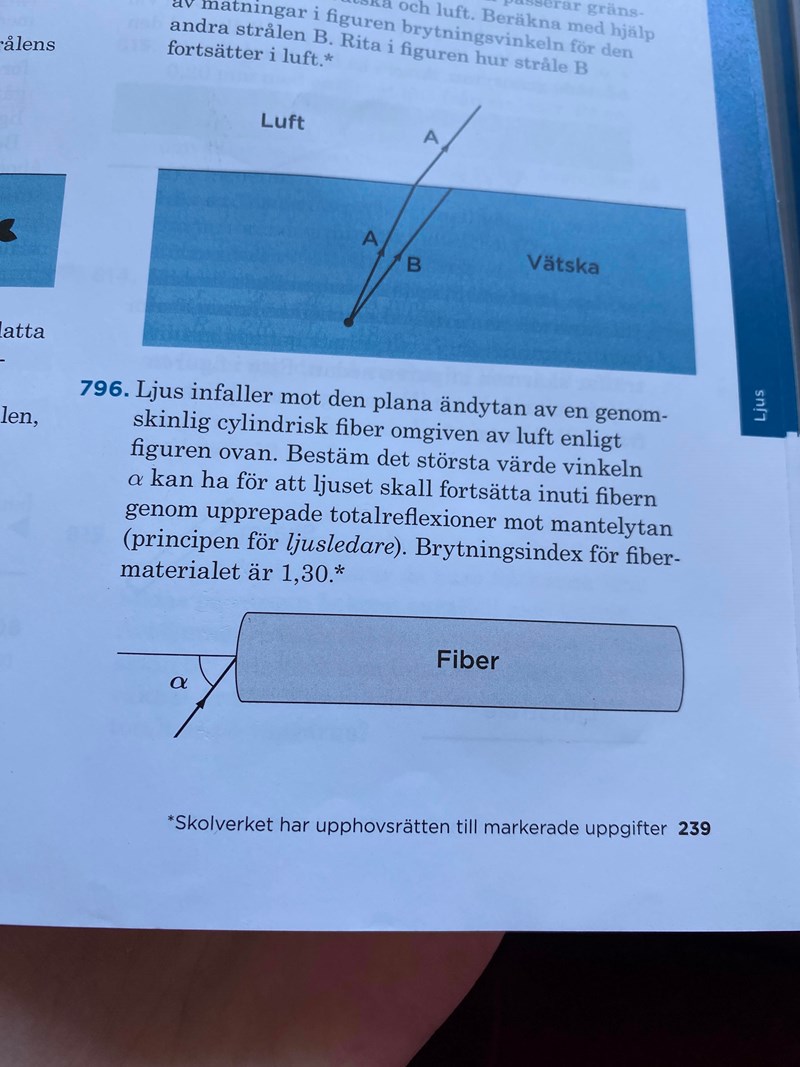 Man måste räkna ut vid vilken vinkel vid B ljuset inte kan ta sig ut från fibern. b > 39,72. Sen får man räkna ut vilken vinkel a som krävs för att b > 39,72 => a > 56,17