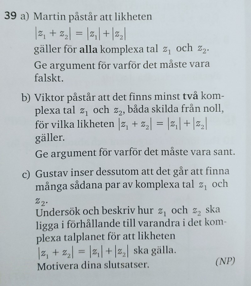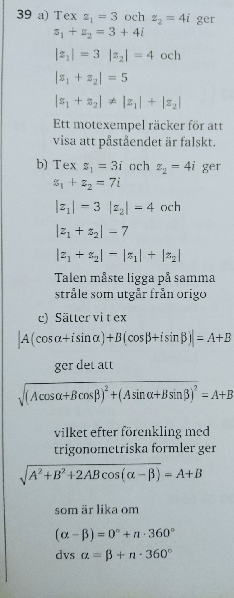 b) Jo, det borde stämma om det ligger på Imaginära eller Reella axlorna? Men i faciten sägs det att det räcker att talen ligger på samma stråle? Men isf, hur kan vara lika som ?