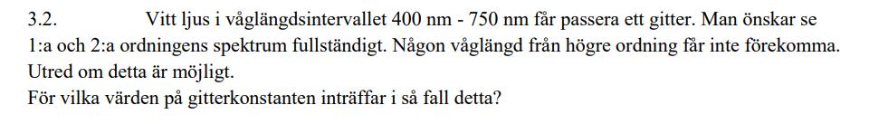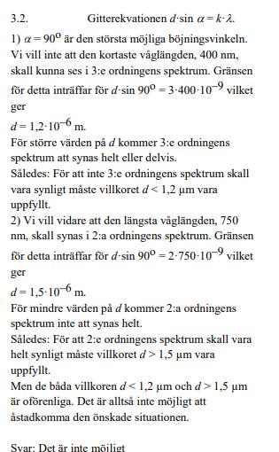 Men om vinkeln uppträder för den längsta våglängden i andra ordningens spektrum borde vi väl inte kunna få några fler linjer eftersom vinkeln skulle bli större än ? Jag ser ju i beräkningarna att det inte är så, men jag är lost ändå. :(