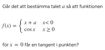 Funktionen är definerad som x+a då x är mindre än noll och cos(x) då x är noll och större än noll. Om man nu ska kunna ha en tangent i punkten då x=0 så måste funktionen vara kontinuerlig (samman satt (över simplifiering)), alltså måste funktionen gå mot samma värde när du närmar dig x=0 från båda sidorna samt med derivatan för att tangenten ska finnas.
