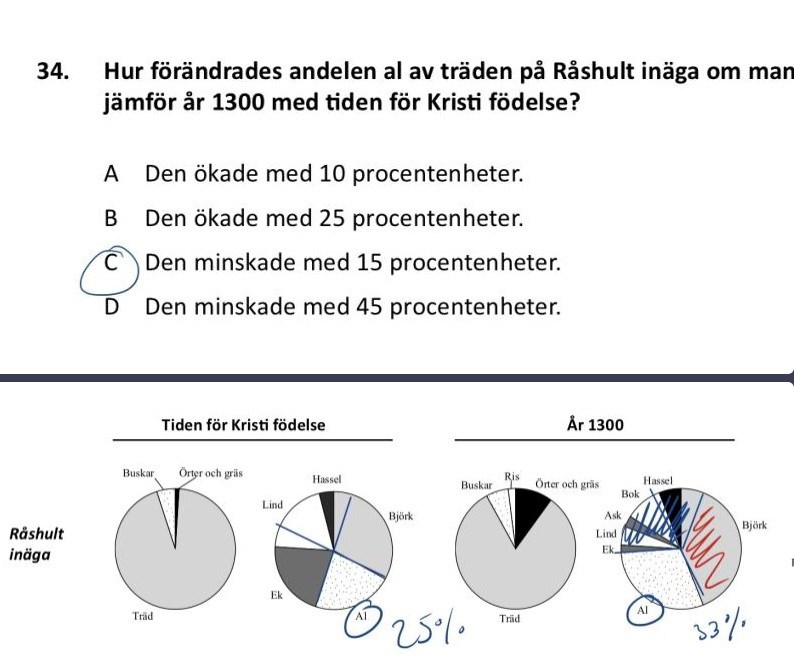 Hur vet man hur mycket andel al av träden fanns på Råshult inäga under året 1300? Spelar det någon roll om det är 35% är det 37%? Svarsalternativen var nära varandra skulle det bli svårare att välja svarsalternativ A. Vilken metod använder du för att beräkna hur många procent i cirkeldiagrammet som utgörs av al?