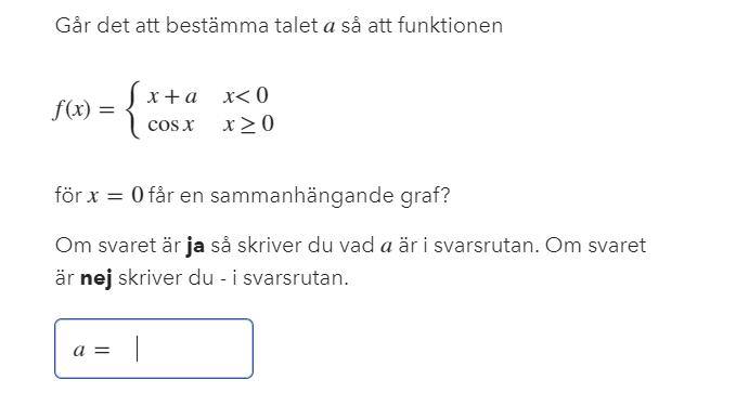 Smaragdalena skrev:Funktionen är lika med cos(x) när x är 0 eller större och lika med a+x när x är mindre än 0, om det går att hitta ett värde på a som gör att funktionen blir kontinuerlig.
