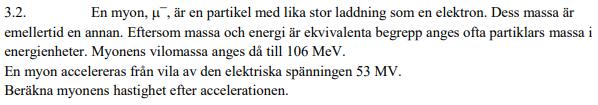 Det jag förstår är att jag måste räkna på ett arbete från det elektriska fältet och få fram hur stor rörelseenergi myonen får. Med den kan jag sedan beräkna hastigheten. Problemet är att jag inte förstår vad som menas med att dess massa anges till 106 MeV? Enheten rör till det ordentligt för mig. Vad är det som är 106 MeV egentligen? Det är väl inte så att m0=106 MeV?