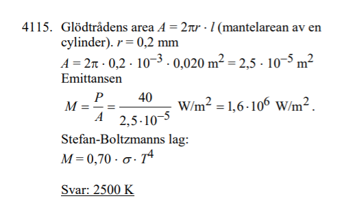 Melampa = 0.70 * Mesvartkropp = 0.70 * P/A. När jag fick ett värde på lampans emittivitet användes den i formeln Me = konstant * T4 => T = 2100 K. Enligt facit är svaret 2500 K.