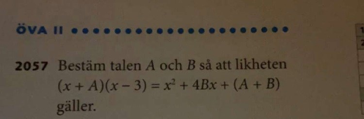 Multiplicera ihop paenteserna i VL. Jämför VL och HL: Om likheten skall gälla för alla värden på x så måste koefficienten för kvadrattermen vara like i VL och HL (det är den, båda är en "osynlig etta"), koefficienten för x-termen måste vara lika och konstanttermen måste vara samma. Du skall ta reda på vilka värden konstanterna A och B måste ha för att detta skall vara sant. Kommer du vidare?