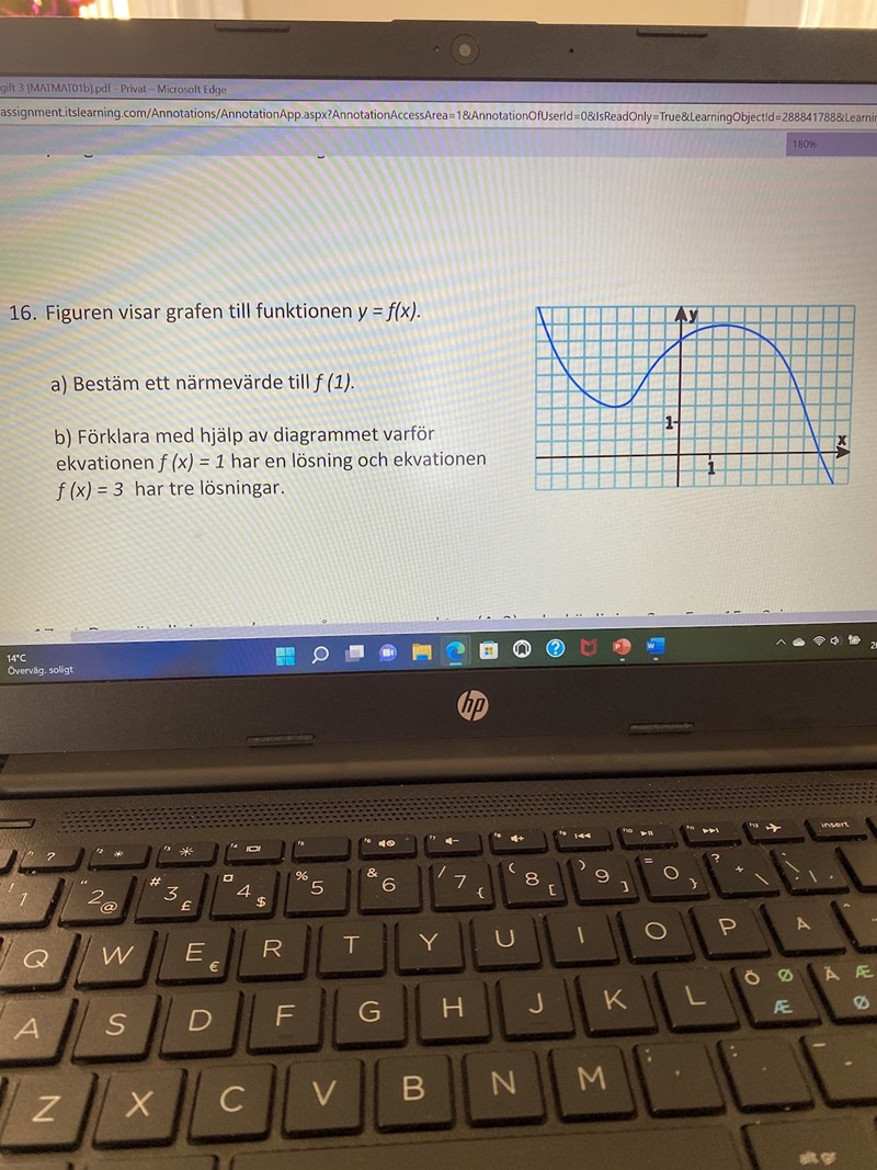 Ekvationen f(x) = 3 har lösningar där denna linje skär grafen till f(x).