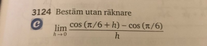 Jag förstår inte hur jag ska lösa denna. Ska jag derivera cos(x) och sedan sätta in pi/6 eller ska jag använda mig av Cos (pi/6 + h) = cos(pi/6) x cos(h) + sin(pi/6) x sin(h)?