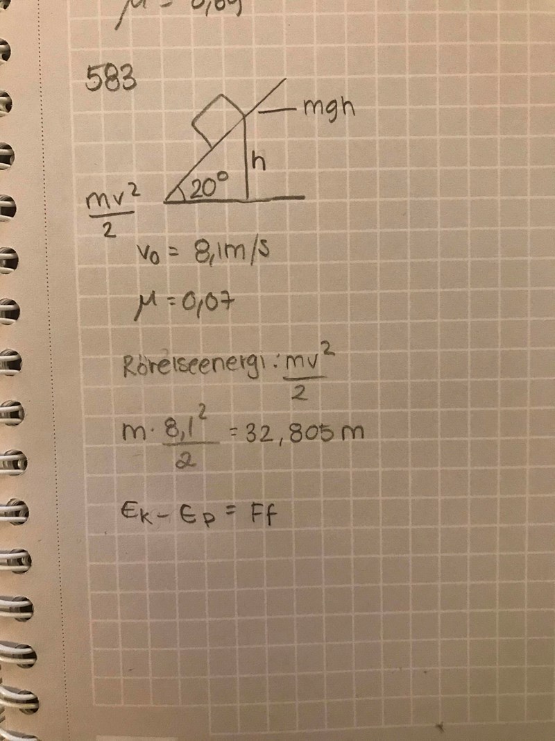 En skidåkare närmar sig en uppförsbacke med lutningsvinkeln 20*. Vid backens början har hon hastigheten 8,1m/s. Beräkna hur lång sträcka s som hon glider uppför backen innan hon stannar. Friktionskoefficienten mellan skidor och snön är 0,07.
