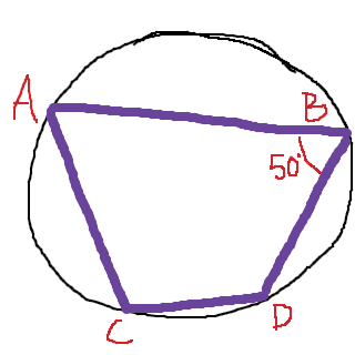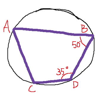 "En fyrhörning ABCD är inskriven i en cirkel. Vinkeln ABC är 50 grader och vinkeln BCD är 35 grader.".