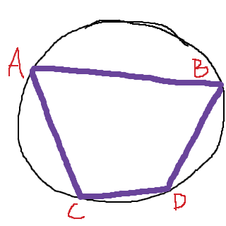 Att fyrhörningen är inskriven i cirkeln innebär att hörnen tangerar cirkelbågen (alltså att fyrhörningens hörn nuddar vid kanten på cirkeln). Då kan vi rita in en godtycklig fyrhörning i vår cirkel:- En fyrhörning ABCD