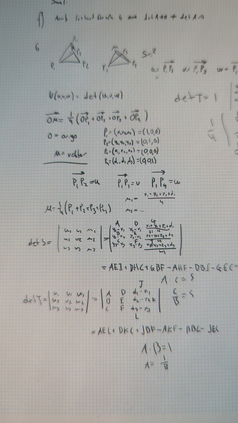 Man behöver uttrycka m.h.a. vektorerna u, v, w för att sedan kunna uttrycka volymen av den mindre tetraedern m.h.a. determinanten och därmed volymen av ursprungstetraedern.