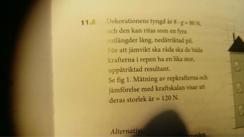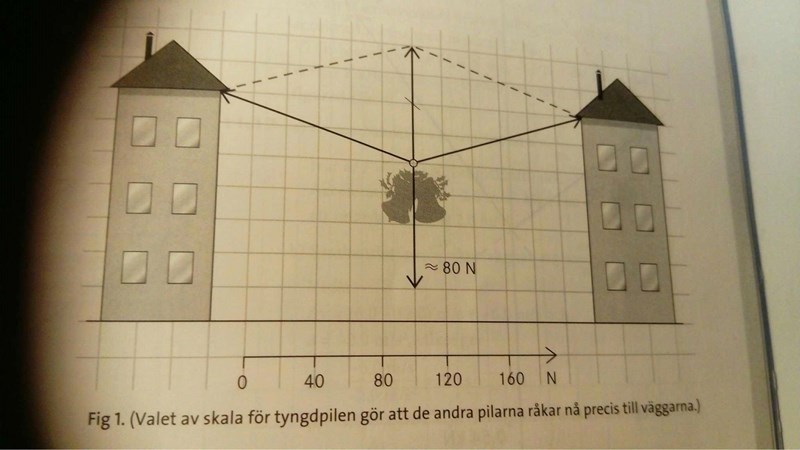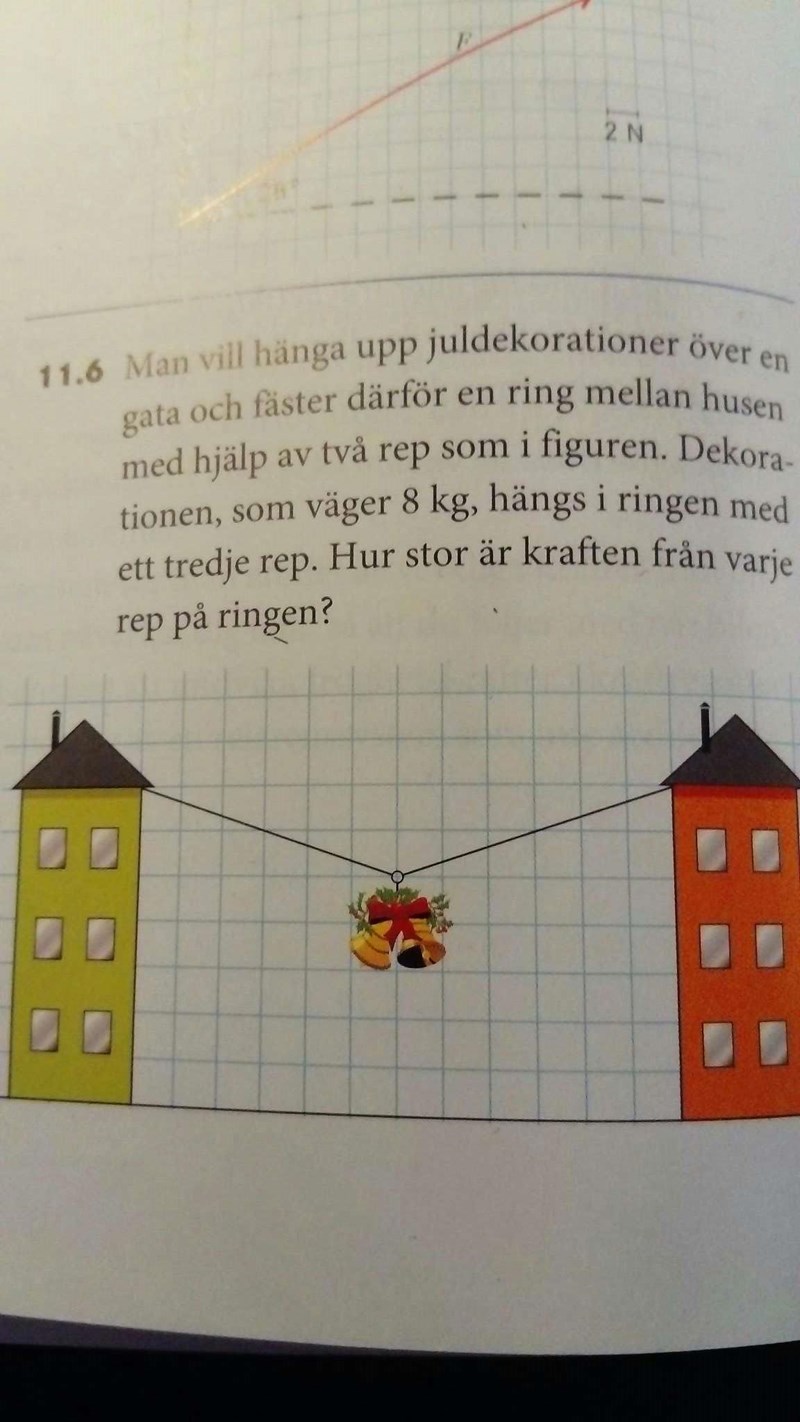 När jag räknade med en ruta 20N så fick jag fram repets längd som 126,49 N. Vilket verkar vara likt det rätta svaret. Fast jag fattar fortfarande inte hur man ska ta reda på en rutas storlek i uppgiften...