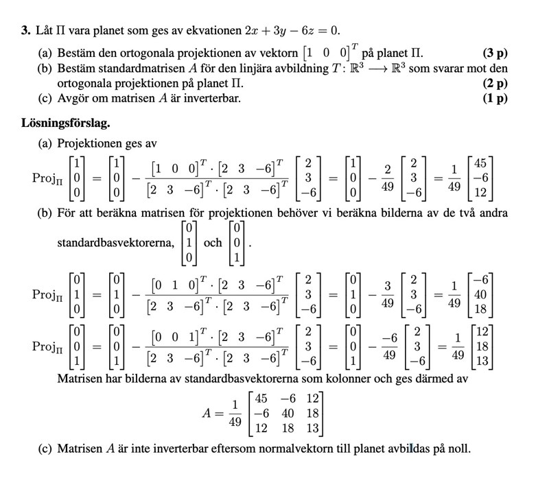 Hur kommer man fram till svaret på c? Jag beräknade determinanten av A och blev noll men det tog lång tid. Vad menas med den meningen de skrev på c, jag fattar inte. "Matrisen A är inte inverterbar eftersom normalvektorn till planet avbildas på noll"