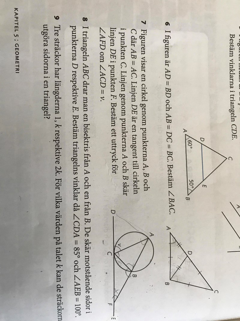 Det var väl uppgift 7? Bilden du har gjort saknar bl a cirkeln, beteckningarna på vinklarna och en notering om att det finns två sträckor som är lika långa. Gör en bättre bild!