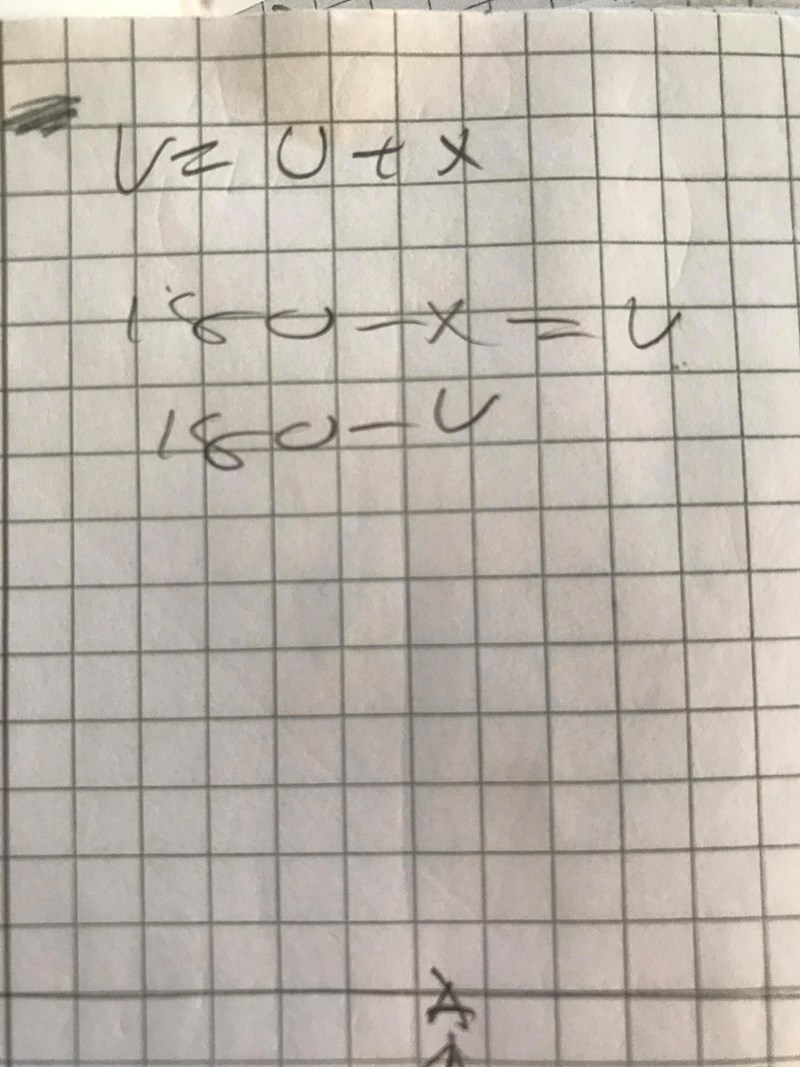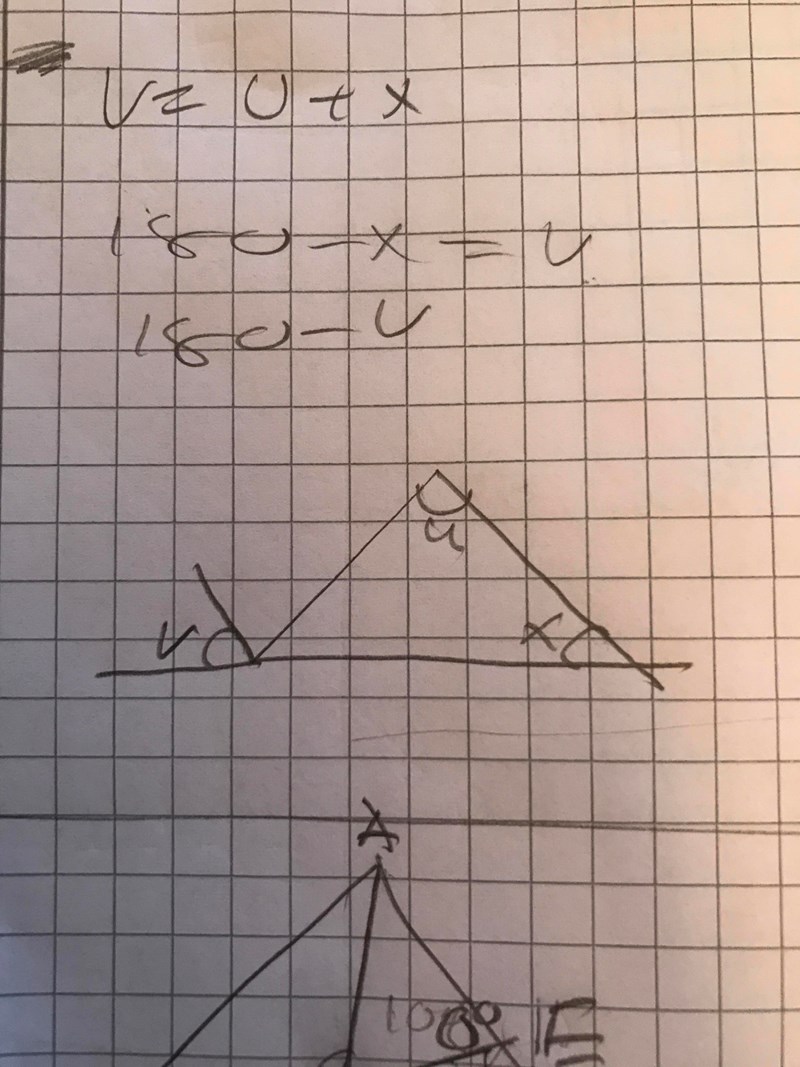 Jag har nu suttit och klurat på denna uppgift. Jag använde mig förstå av yttervinkelsatsen men eftersom det fanns en likbent triangel också så gick inte mitt sätt helt. Jag vet inte hur jag ska lösa denna uppgift eller åtminstånde veta hur jag ska börja. Facit säger 3v-180. Jag fick 180-v men jag vet att det är helt fel. Det är uppgift 7.