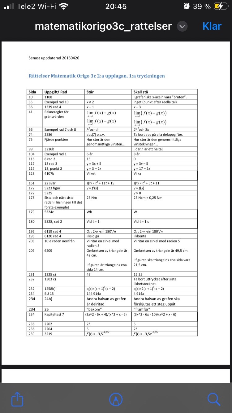 Igår satt jag med äldsta dottern, övade rationella funktioner och polynom. Efter att ha ruttnat ett par gånger på uppenbara fel i både uppgifter och facit laddade jag ned rättelser till hennes bok. Det var två sidor!
