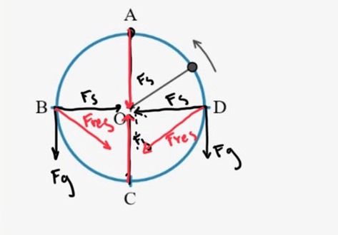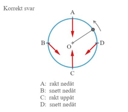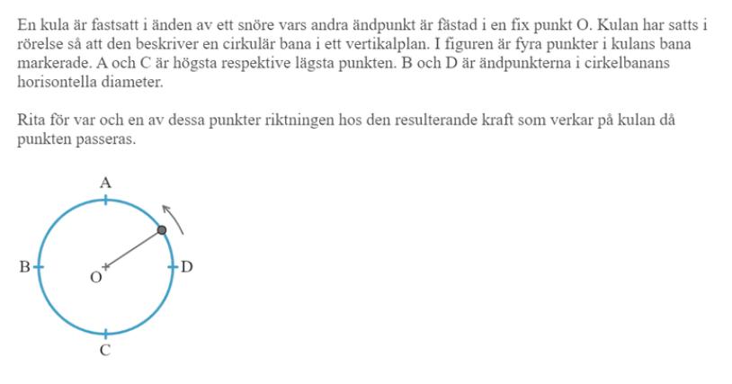 Okej då förstår jag typ. Jag förstår varför den resulterande kraften i D och B får den riktningen. Men jag förstår inte helt. Den resulterande kraften är ju centripetalkraften, och den ska väll alltid vara riktad mot cirkelns centrum??