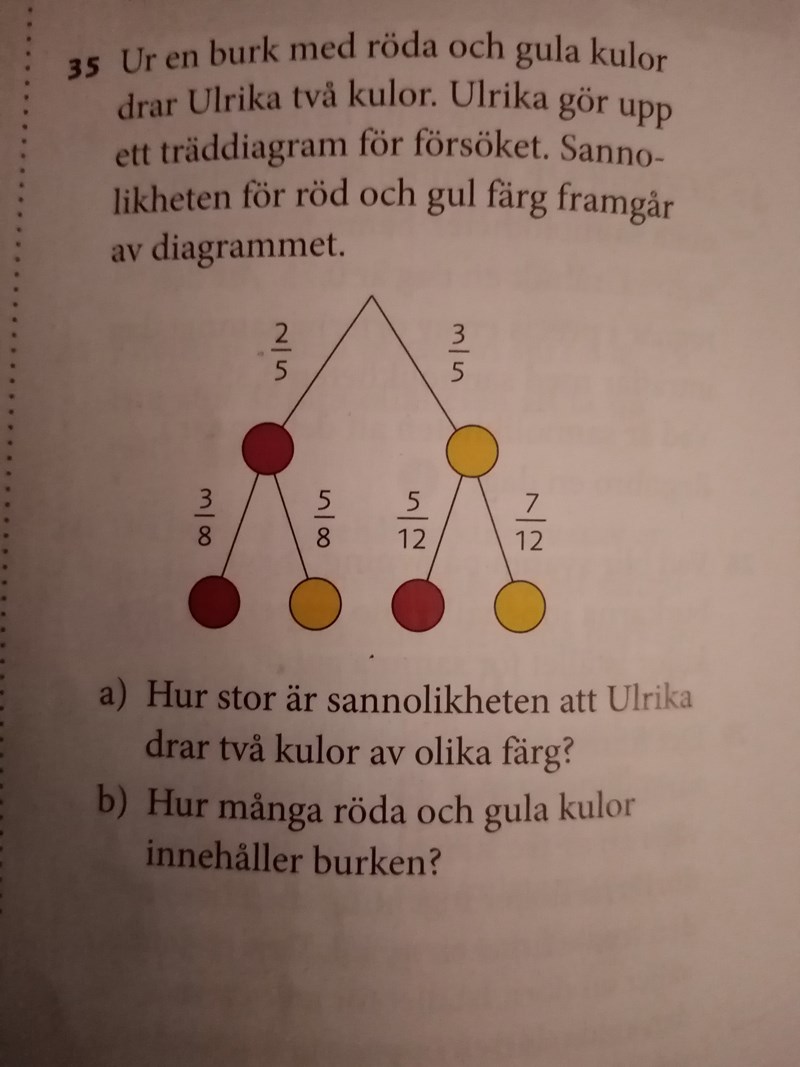 Jag har löst a men jag förstår inte b. Hur kan 2/5 dvs 2 röda kulor - 1 röda kula leda till att sannolikheten för att få en röd kula på nästa försök bli 3/8? Och hur kan man veta hur många röda och gula kulor det finns totalt?