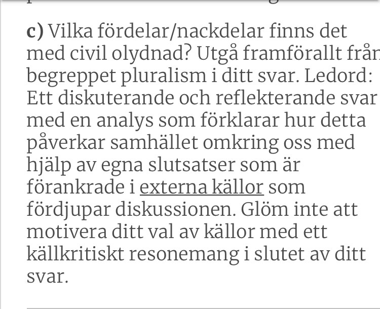 Du ska beskriva fördelar och nackdelar med civil olydnad. Du måste då såklart kolla upp det begreppet.