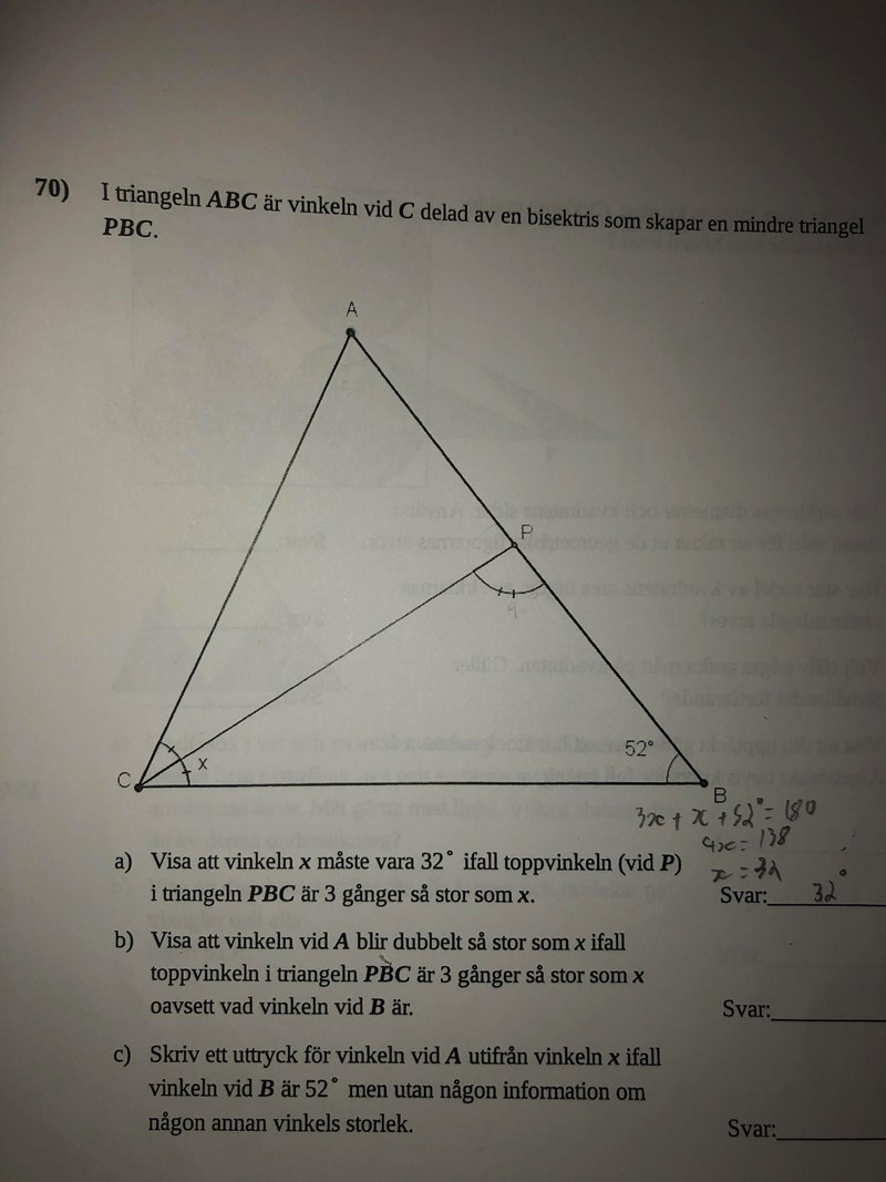 Det enda jag förstår är att jag ska bevisa att ^A=2x ... Toppvinken i triangeln är ju ^A. Hur kan den vinkeln vara både 3 ggr större än x och dubbelt så stor?