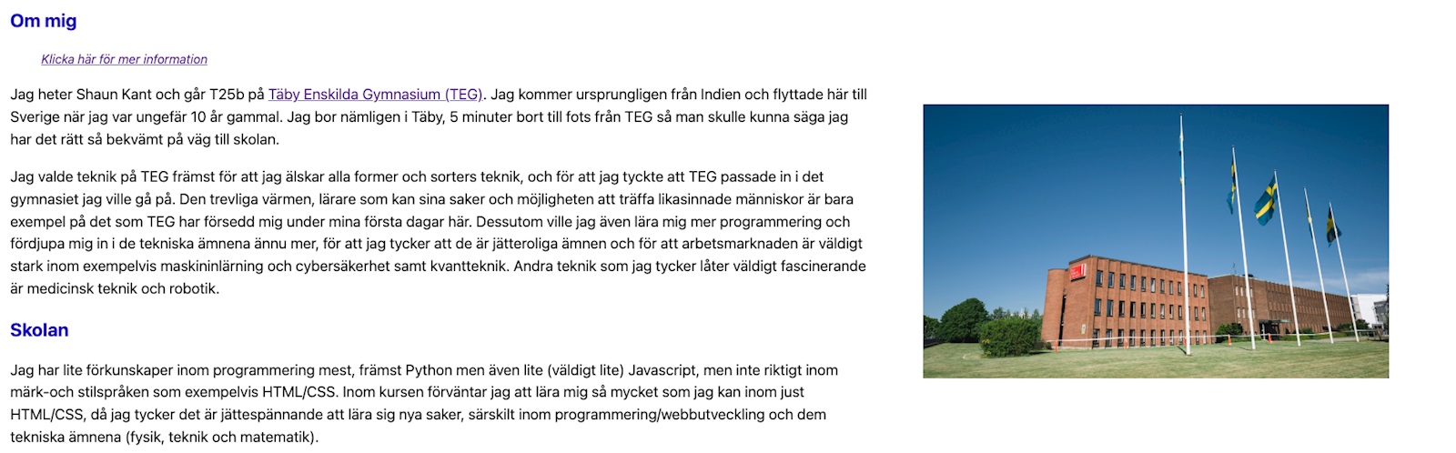 Jag ska göra en hemsida om mig själv och jag stötte på en problem: min figcaption (Klicka här för mer information) går inte under andra bilden (bild på min skola):