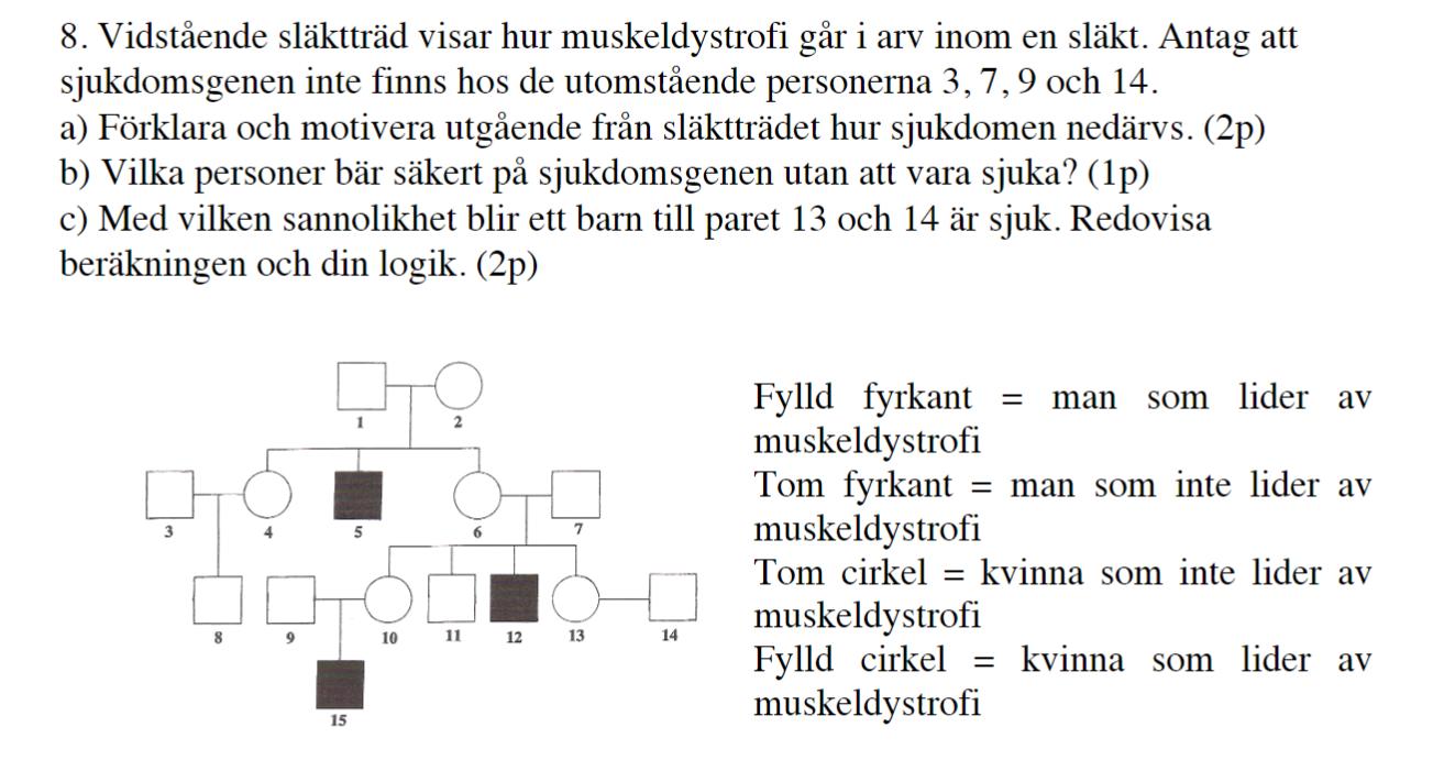 Jag har listat ut att nedärvningen måste vara könsbundet recessiv, samt att 2, 6 och 10 säkert bär på sjukdomen. Men på c) blir jag lite förvirrad.