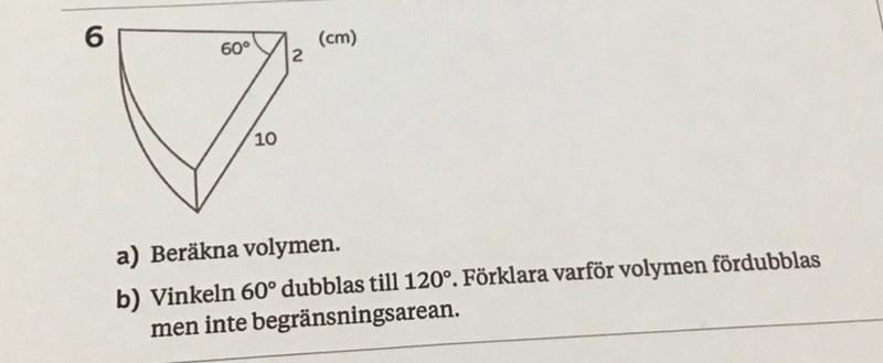 Jag förstår inte fråga a. Vet inte vilken metod jag ska använda för att ta fram volymen och jag trodde först att det hade något med cirkelsektor att göra men det funkar inte. Behöver verkligen hjälp inför ett prov!!!